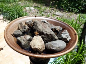 So with cats bird watching no birds used our bird bath but the bees did. We've added the rock so the bees don't drown. Judi