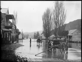 View of carriages in a flooded street in Kaeo, Northland, also showing buildings and houses surrounded by flood waters. Photograph taken circa 1910s by Arthur James Northwood. Ref: 1/1-005719-G. Alexander Turnbull Library, Wellington, New Zealand
