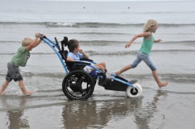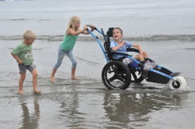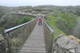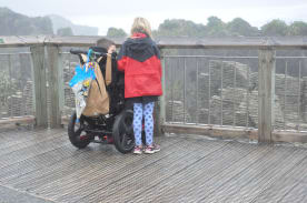 Kimberly's daughter Rosie, pushing Finlay along a bridge at Pancake Rocks