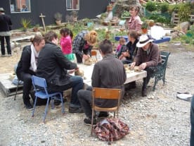 The Turn Turn Turn project involved three artists from the College of Creative Arts from Massey University (Wellington Campus). Having made an initial approach through Gap Filler earlier in then year, to bring a creative experience to 'quake-battered Christchurch, the three artists travelled south last weekend and ran workshops on Saturday and Sunday at the Lyttelton Petanque Club site, a community space developed by Gap Filler and the local community for all to access and enjoy.