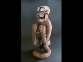 Monkey statue. Probably Bulu, S. Cameroon. The white eyes indicate vision into the world of spirits. For the rest, the non-initiated can only guess at the symbolism; the bound hands, the gourd positioned to catch fluids...