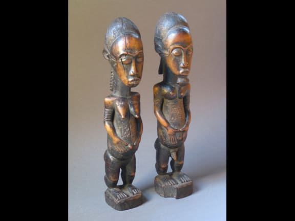 Blolo bian couple, Baoulé, Ivory Coast. These statuettes represent spouses from the world of the dead, who may cause problems and bad luck for couples in the world of the living, due to jealousy. These statues must be housed and shown appropriate respect. For this reason also, an other-world spouse is depicted as especially beautiful.