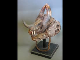 Ceremonial head crest. With creativity worthy of Weta Workshop, the artist has used a goat horn and two hippopotamus teeth to make of this baboon skull a fantastic animal.