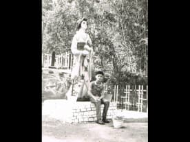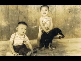 Swee Tung (seated on the puppy) next to his elder brother, Senggarang Village, Malaysia.