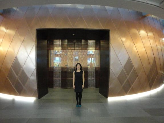 Elizabeth Chan, inner entrance to the kauri cone shaped Supreme Court.