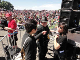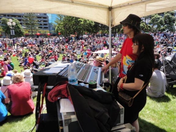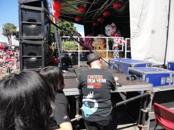 Lynda and the technical crew in front of the audience at Frank Kitts Park, Chinese New Year.