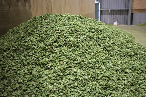 On the floor behind the kilns are large piles of Motueka and Riwaka hop cones, waiting to be pressed and baled.