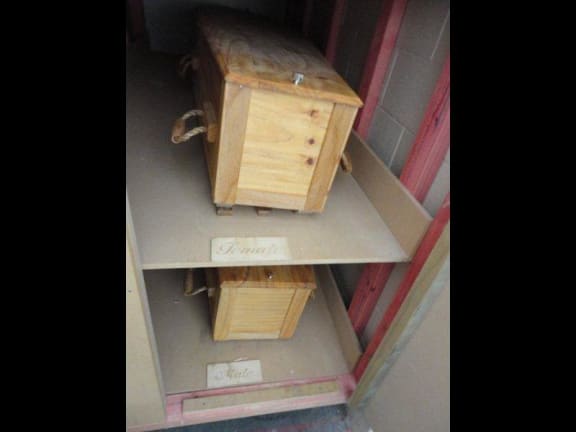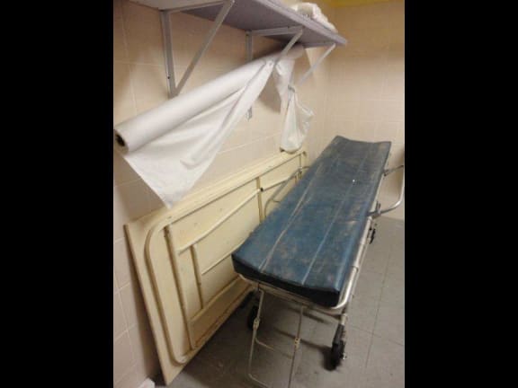 The gurney and roll of plain white cotton used to wrap bodies, Pakuranga.