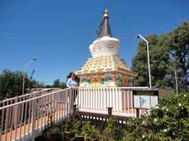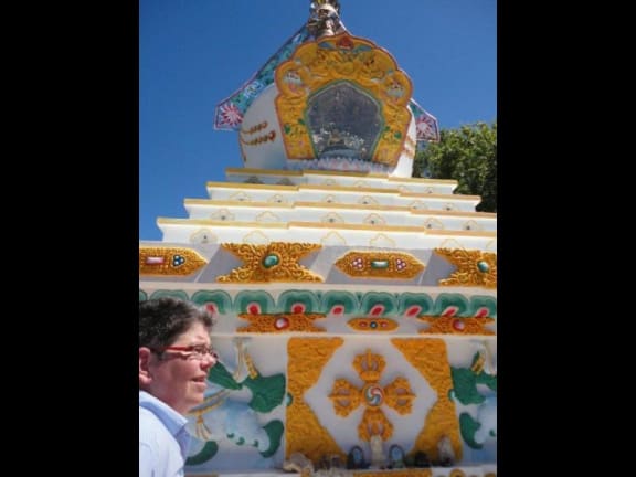Joan Buchanan and the stupa at Dorje Chang Institute, Auckland.