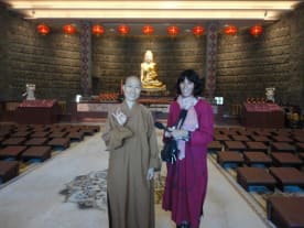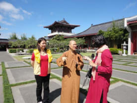 In the courtyard, Translator Amanda, Venerable Manwang, Abess with Fo Guang Shan and Lynda.