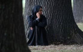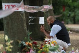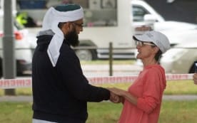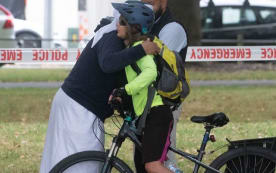 A woman hugs a man across the road from the Masjid Al Noor mosque.