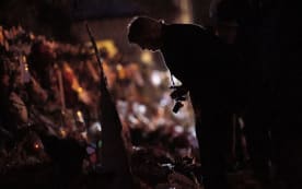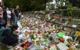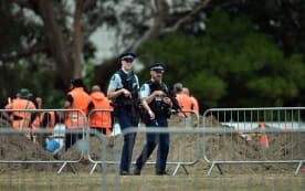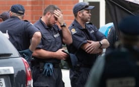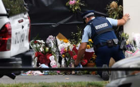 Police patrol a cemetery in Christchurch as workers prepare grave sites.