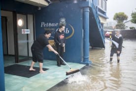 Water is swept out of the Petone Working Man's Club on 15 November 2016. Photo: RNZ / Aaron Smale