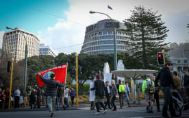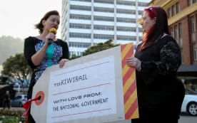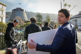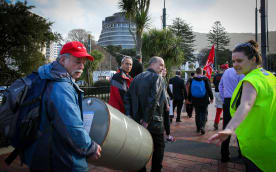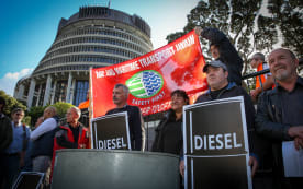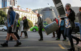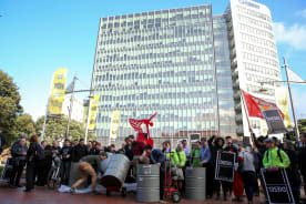 Protesters gather outside the Wellington Train Station to highlight what they say is KiwiRail's potential decision to replace electric trains with diesel ones.
