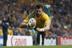 Australia's wing Adam Ashley-Cooper scores the first try during a quarter final match of the 2015 Rugby World Cup between Australia and Scotland.