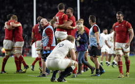 Wales' centre Jamie Roberts (3rd right) gestures as he celebrates with teammates winning a Pool A match against England.