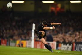 Dan Carter kicks the ball during a Pool C match between New Zealand and Georgia on October 2,