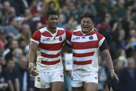 Japan's Amanaki Mafi (L) and Hiroshi Yamashita (R) react after their victory at the end of the Pool B match against South Africa.