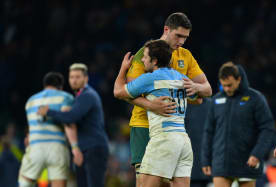 Argentina's fly half Nicolas Sanchez (R) hugs Australia's lock Rob Simmons (L) after a semi-final match.