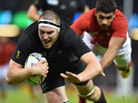 Brodie Retallick scores the first try during a quarter final match of the 2015 Rugby World Cup between New Zealand and France on October 17,