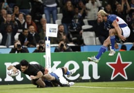 Nehe Milner-Skudder (L) scores his team's second try as Namibia's captain and flanker Jacques Burger (C) tackles him and Namibia's wing Conrad Marais (R) jumps during a Pool D match.
