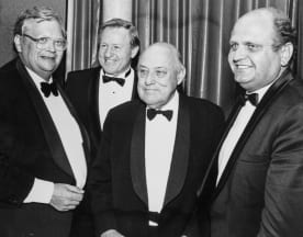 Four New Zealand Prime Ministers - David Lange, Jim Bolger, Sir Robert Muldoon and Mike Moore - at Muldoon's 1992 valedictory dinner at the Wellington Club.