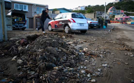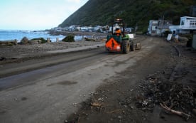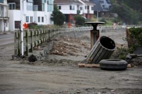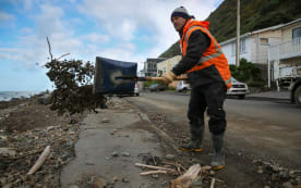 Lots of debris washed over the road in Owhiro Bay, Wellington. Photo: RNZ / Alexander Robertson