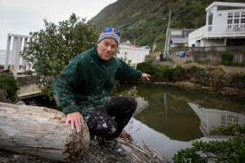 Owhiro Bay resident Scott Viner, next to what is usually a small stream but has been turned into a dam. Photo: RNZ / Alexander Robertson