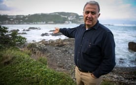 Owhiro Bay resident Costas Kotsapas has seen about 3 metres erode from the waterfront in the 38 years he's live here. Photo: RNZ / Alexander Robertson