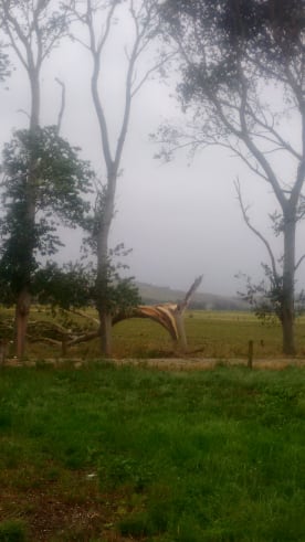 Trees that had been standing at least 15 years south of Ruawai in Northland torn down by the storm, early on Friday morning. "Good gusts 80kph on wind gauge". Photo: Tony Wright