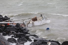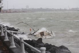 A yacht is damaged in the storm at Tamaki Drive. Photo: RNZ / Dan Cook