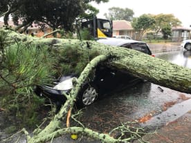 The driver of this car in Ōtāhuhu had a lucky escape when a large pine tree fell on her vehicle. Photo: Facebook / Counties Manukau Fire Area