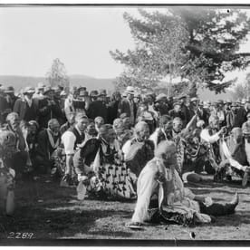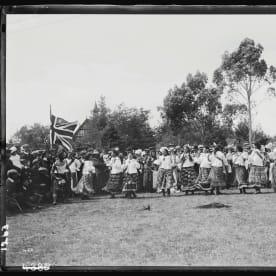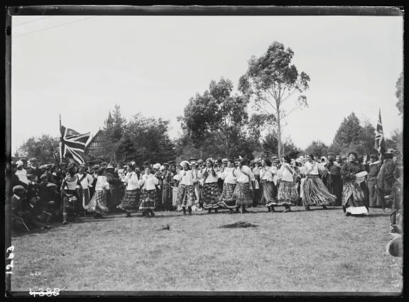 Women perform at the welcome ceremony for the Prince of Wales at Arawa Park, 1920. (James McDonald, Te Papa)