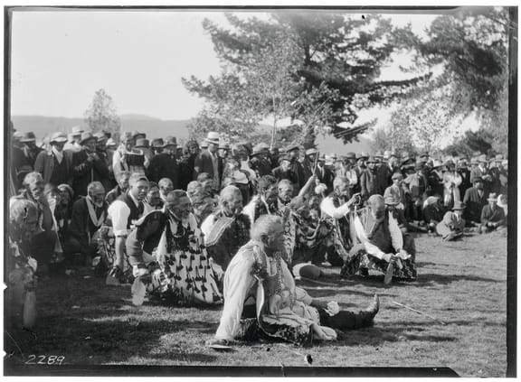 Tangi of welcome to the Prince of Wales in Rotorua, 1920. (James McDonald, Te Papa)