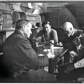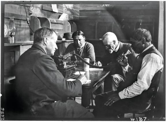 From left: James McDonald, Hēnare Te Raumoa Balneavis, Elsdon Best and an unnamed man making a recording during the Hui Aroha in Gisborne, 1919. (James McDonald, Te Papa)