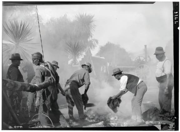James McDonald took a series of photographs at Hui Aroha, Gisborne, 1919, showing the preparation of food, here lifting the hāngi. (James McDonald, Te Papa)