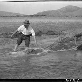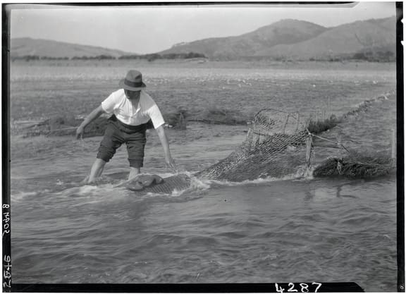 Te Rangihīroa setting a hīnaki in a channel, Waiapu River, 1923. (James McDonald, Te Papa)