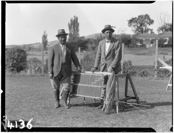 Apirana Ngata (left) and Te Rangihīroa weaving a tukutuku panel together, Waiomatatini, 1923. (James McDonald, Te Papa)