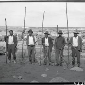 From left: Apirana Pipi or Urupa, Wi Maraki, Hamuera Ngārimu, Frank Sweeney, Eruera Tuari and Wi Hunia at Mataahu, Gisborne, 1923. (James McDonald, Te Papa)