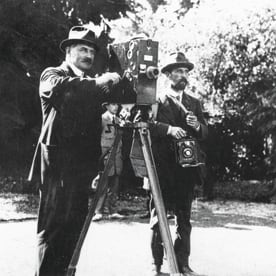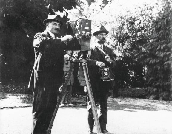 James McDonald and Johannes Andersen filming during the Hui Aroha in Gisborne, 1919. (Salmond Family Archive)