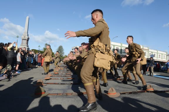 The haka ‘Ka mate’ is performed by volunteers in front of the Wī Pere Memorial during Hui Aroha commemorations in Gisborne, 2019. (Natalie Robertson, private collection)