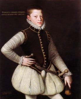Archduke Rudolf, the later Holy Roman Emperor Rudolf II. of Austria, son of Holy Roman Emperor Maximilian II. of Austria and Infanta Maria of Spain, 1567 He is wearing pumpkin hose (pluderhose) with a codpiece.