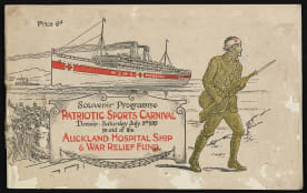 Souvenir programme. Patriotic sports carnival. Domain, Saturday July 3rd 1915 in aid of the Auckland Hospital Ship & War Relief Fund. Price 6d. [Front cover. 1915]. [Ephemera relating to patriotism, fundraising for the war effort, during World War I. 1914-1918. Folder 1]. Ref: Eph-A-WAR-WI-Patriotic-1915-01-front. Alexander Turnbull Library, Wellington, New Zealand. http://natlib.govt.nz/records/31984036