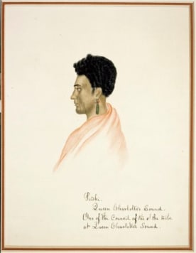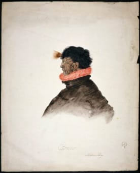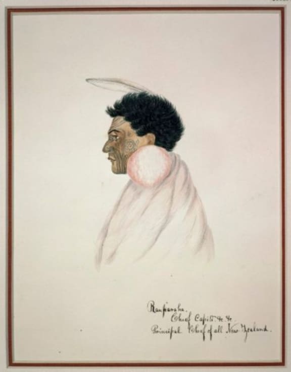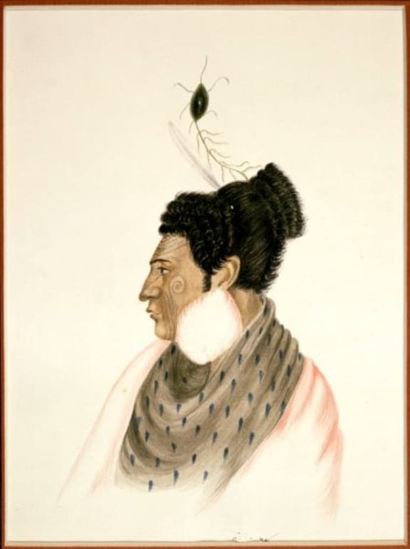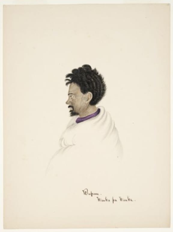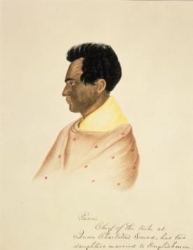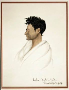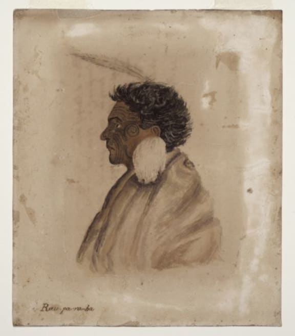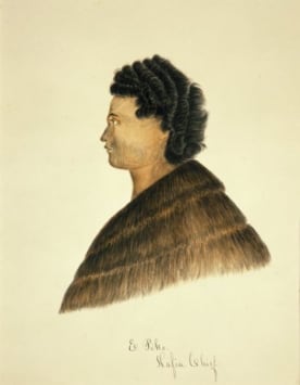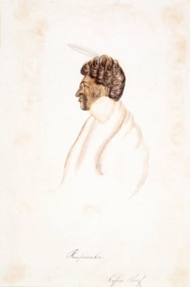 Profile head and torso portrait of Te Rauparaha, a fighting chief of the Ngati Toa tribe. Coates, Isaac, 1808-1878. [Coates, Isaac] 1808-1878 :Rau-pa-ra-ha [1843?]. Ref: A-286-020. Alexander Turnbull Library, Wellington, New Zealand. http://natlib.govt.nz/records/22809854