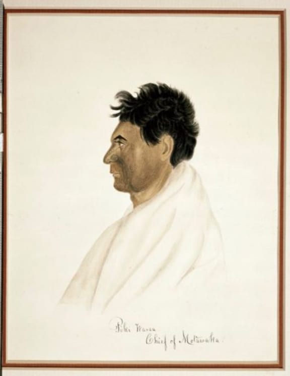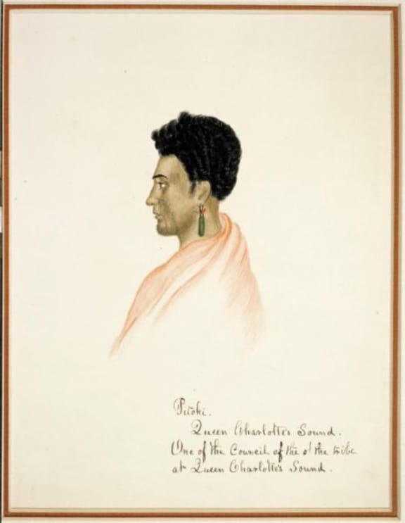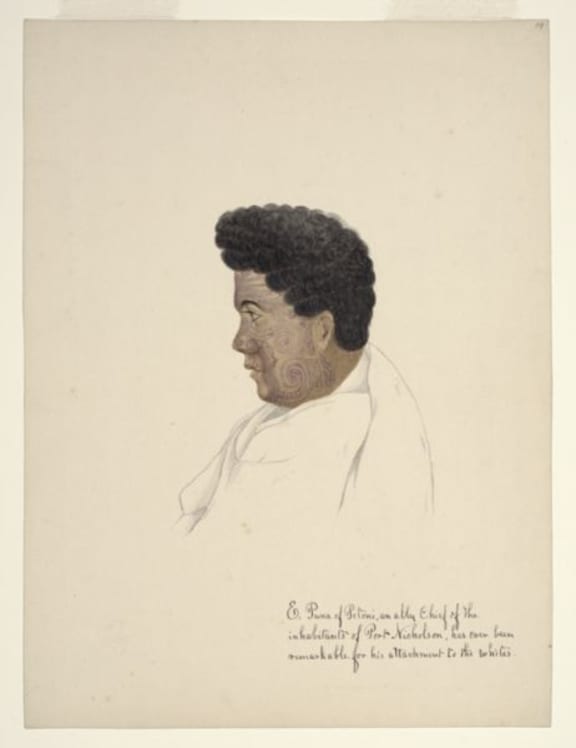 Head and shoulders profile portrait of Piki Warra, principal chief of Motueka pa. Coates, Isaac, 1808-1878. [Coates, Isaac] 1808-1878: Piki Warsa. Chief of Motuwaka. [1843?]. Ref: A-286-007. Alexander Turnbull Library, Wellington, New Zealand. http://natlib.govt.nz/records/23010064