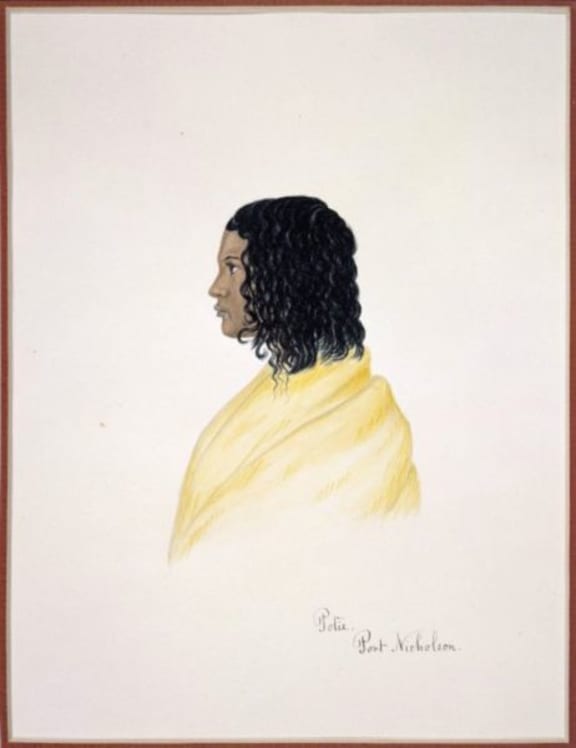 Head and shoulders profile portrait of a Maori man, possibly Wiremu Potiki, of Queen Charlotte Sound, who signed the Treaty of Waitangi. Coates, Isaac, 1808-1878. [Coates, Isaac] 1808-1878 :Pitoki. Queen Charlotte's Sound. One of the Council of the tribe at Queen Charlotte's Sound. [1843?]. Ref: A-286-019. Alexander Turnbull Library, Wellington, New Zealand. http://natlib.govt.nz/records/23158957