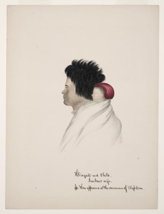 Head and shoulders profile portrait of Maori woman with baby in red cap asleep on her back. Coates, Isaac, 1808-1878. [Coates, Isaac] 1808-1878 :Hingatu and child. Iwikau's wife. As they appeared at the ceremony of Baptism. [1843?]. Ref: A-286-005. Alexander Turnbull Library, Wellington, New Zealand. http://natlib.govt.nz/records/22899882