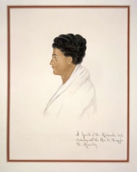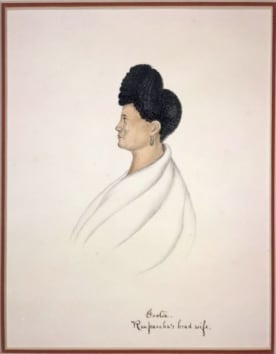Head and shoulders profile portrait of Pipi Kutia, stepdaughter & wife of Te Rauparaha. Coates, Isaac, 1808-1878. Date: 1843 [Coates, Isaac], 1808-1878 :Cootia. Rauparaha's head wife. [1843?]. Ref: A-286-013. Alexander Turnbull Library, Wellington, New Zealand. http://natlib.govt.nz/records/22734354