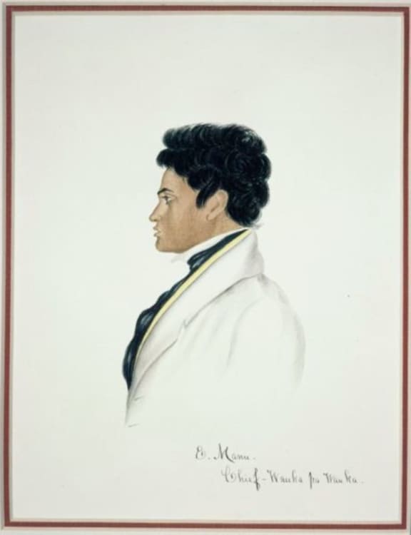 Head and shoulders profile portrait of Wiremu Katene te Puoho, also known as te Manu or Manu, son of te Puoho o te Rangi and Kauhae of Ngati Tama tribe, and chief of one of the pa in the Whakapuaka district in the 1840s. Shown in European dress. Coates, Isaac, 1808-1878. [Coates, Isaac], 1808-1878 :E Manu. Chief - Wauka pa Wauka. [1843?]. Ref: A-286-001. Alexander Turnbull Library, Wellington, New Zealand. http://natlib.govt.nz/records/22468794
