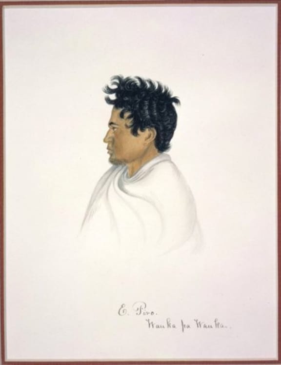 Head and shoulders profile portrait of E Piko, chief of Motueka pa, wearing a kiwi feather cloak. Coates, Isaac, 1808-1878. [Coates, Isaac] 1808-1878 :E Piko. Kafia chief. [1843?]. Ref: A-286-006. Alexander Turnbull Library, Wellington, New Zealand. http://natlib.govt.nz/records/23235473